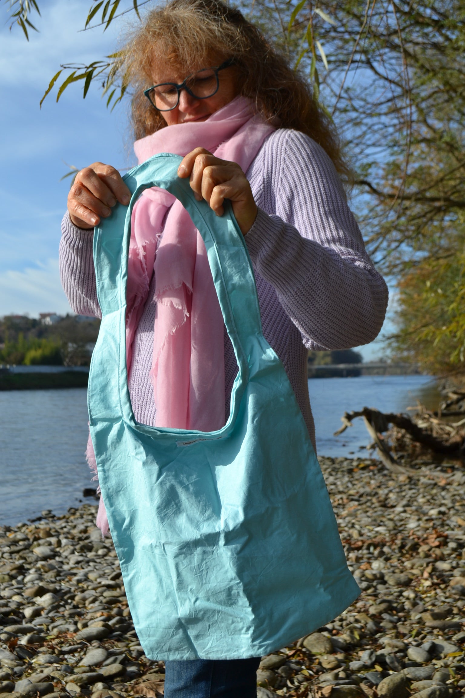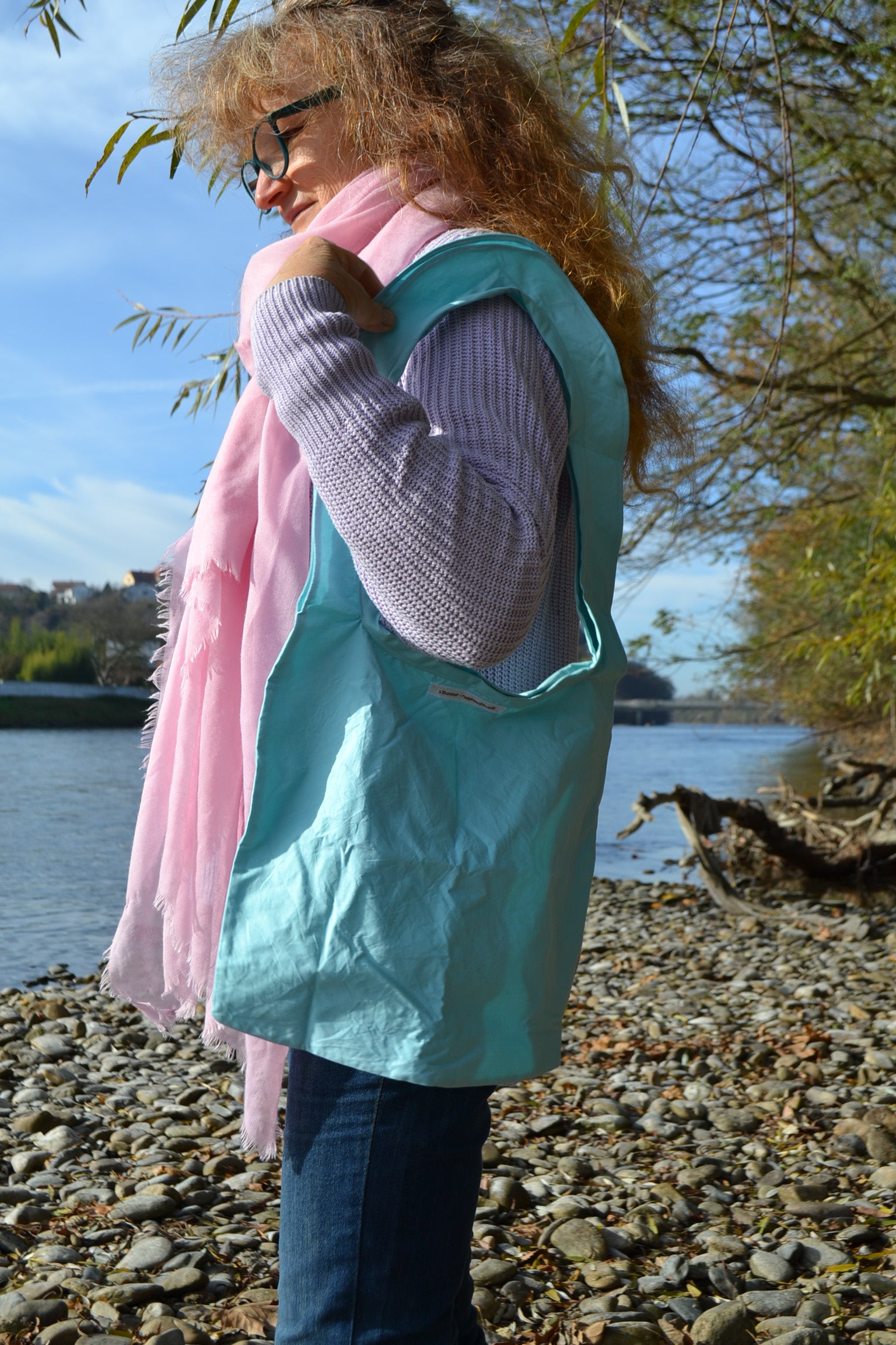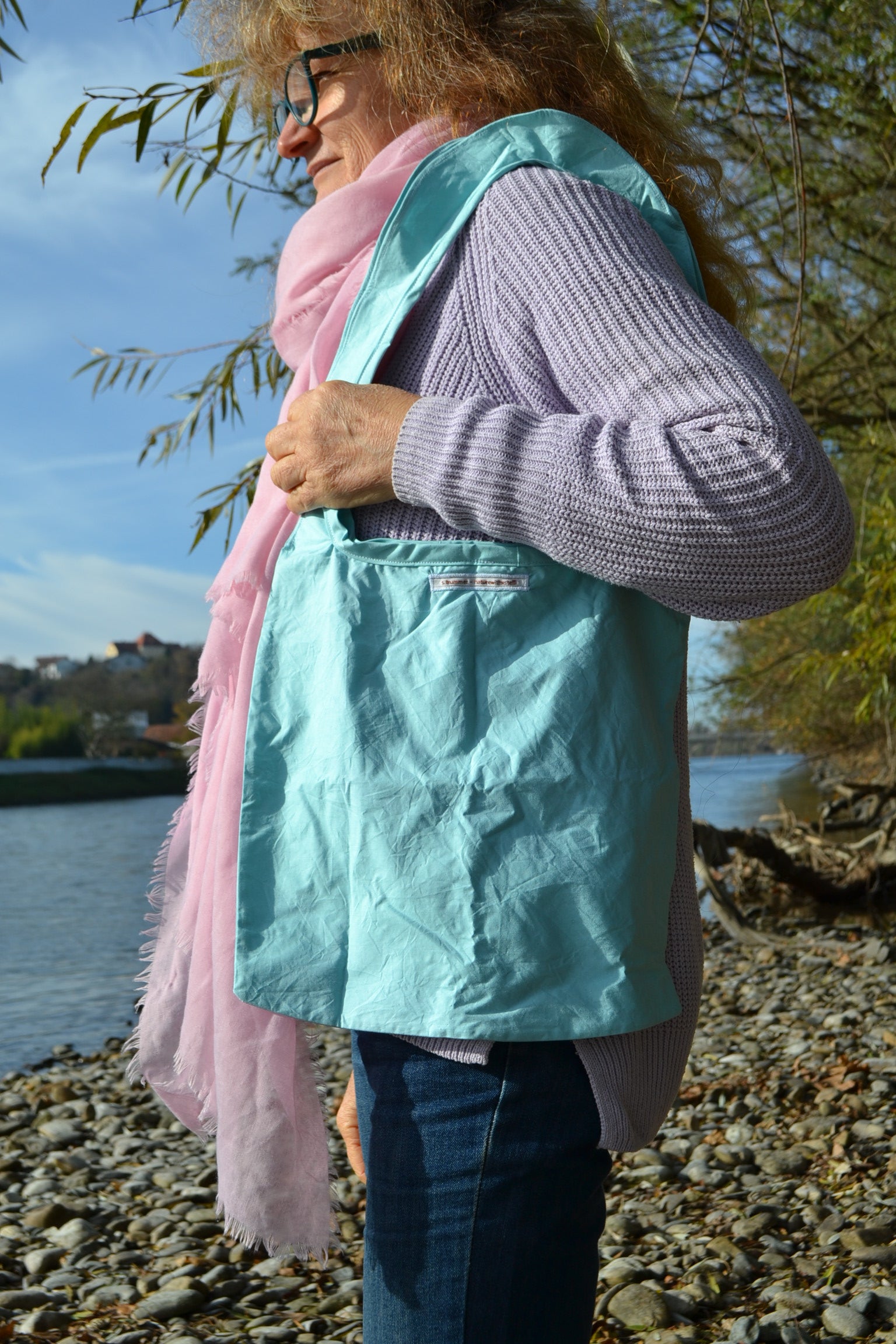 Die faltbare Einkaufstasche Türkise ist ideal für den Fall, dass man beim Einkaufen doch mehr Platz braucht! Einfach den Beutel mit der Einkaufstasche darin mit dem secondhand Schnürsenkel an der normalen Handtasche anbringen oder einfach rein tun und schon hat man für alle Fälle eine zusätzliche platzsparende Tasche dabei!