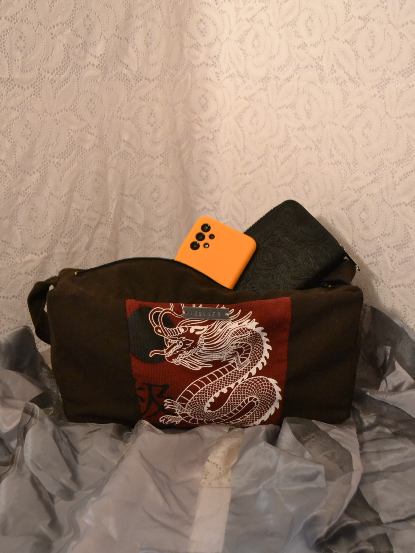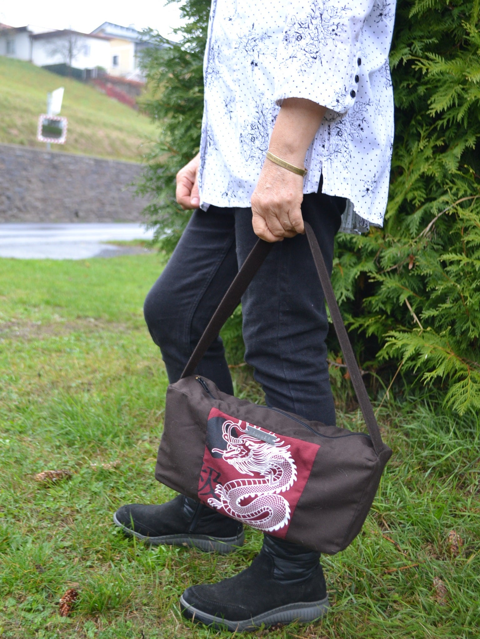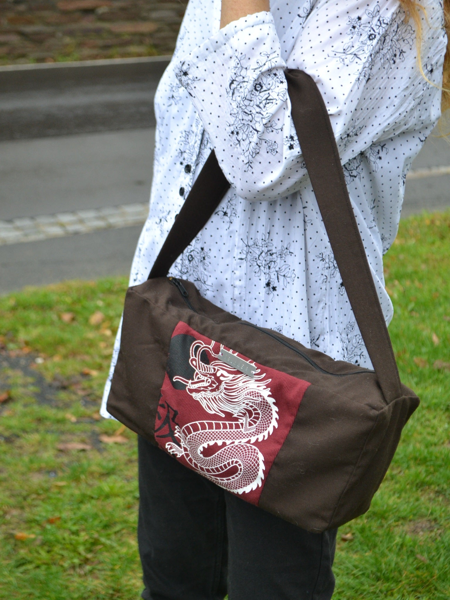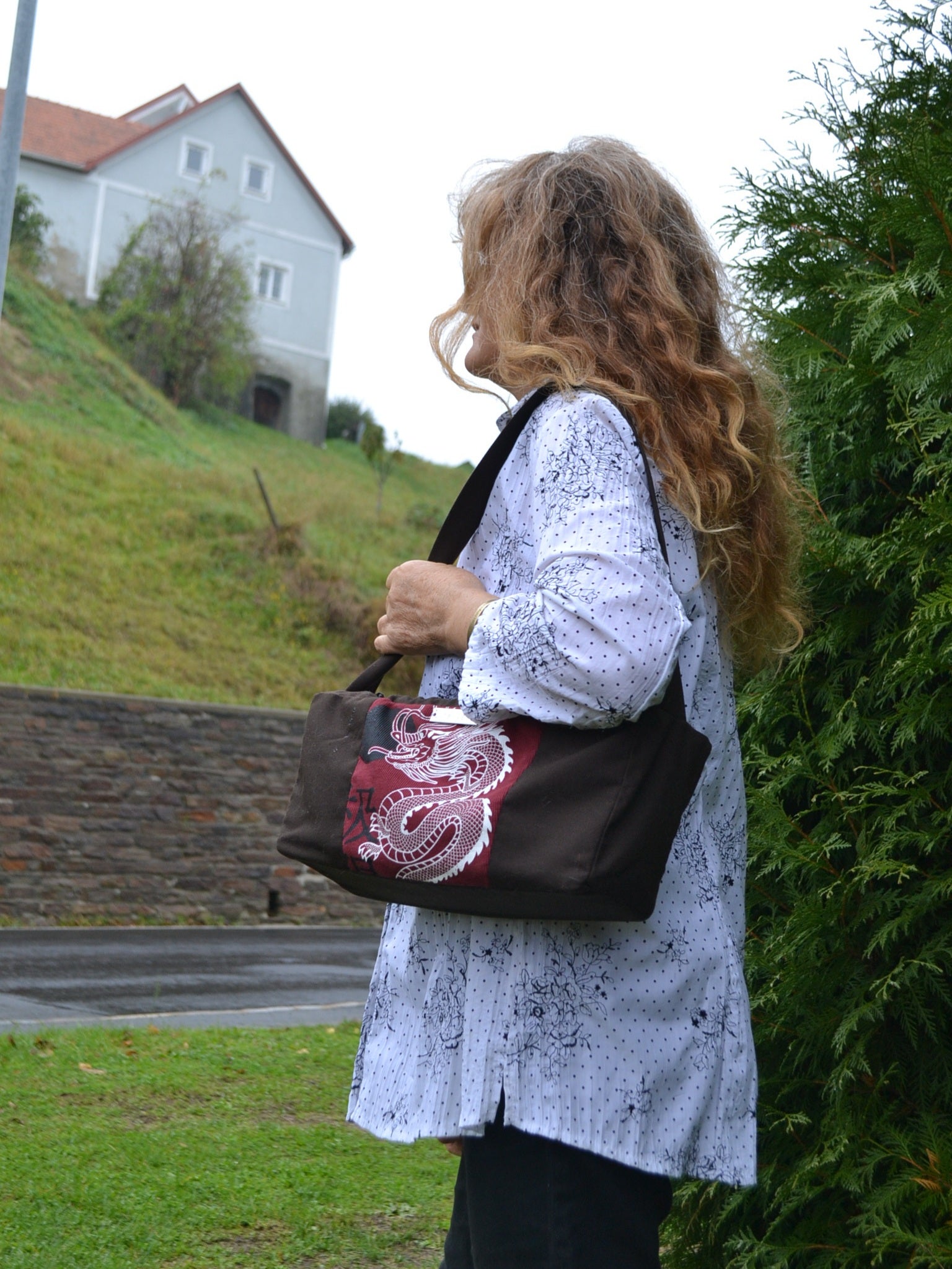 Diese Handtasche, aus zweiter Hand Stoffen und Kleidung, wurde mit großer Sorgfalt in Österreich handgefertigt. Sie ist die perfekte Wahl für jeden Anlass, von Familientreffen bis hin zu Party machen in Clubs. Sie bietet ausreichend Platz für alle persönlichen Gegenstände, die man mit sich führen möchte. Das Drachenmotiv auf der Vorderseite ist ein wahres Highlight und ein Hingucker bei jeder Veranstaltung!