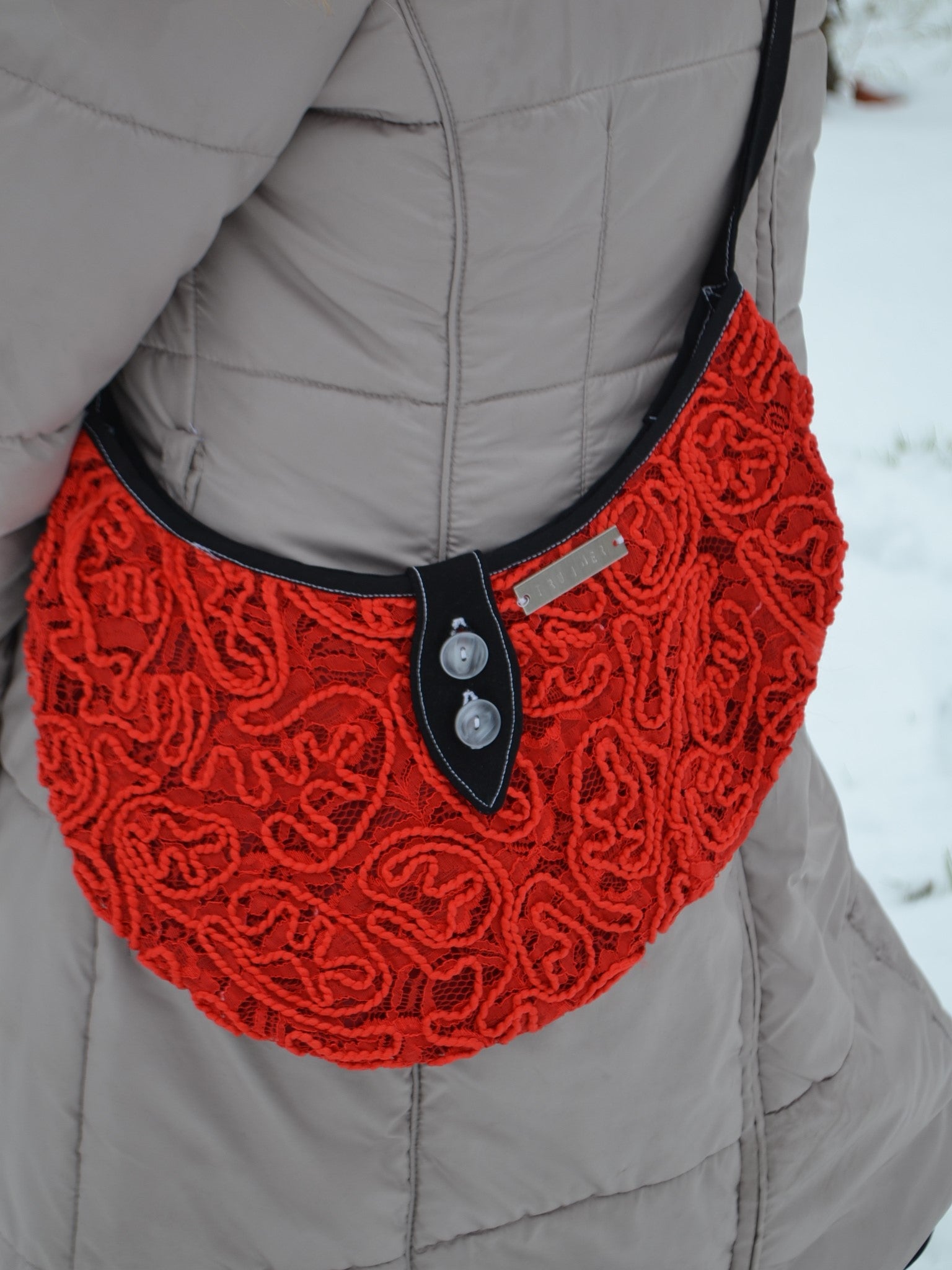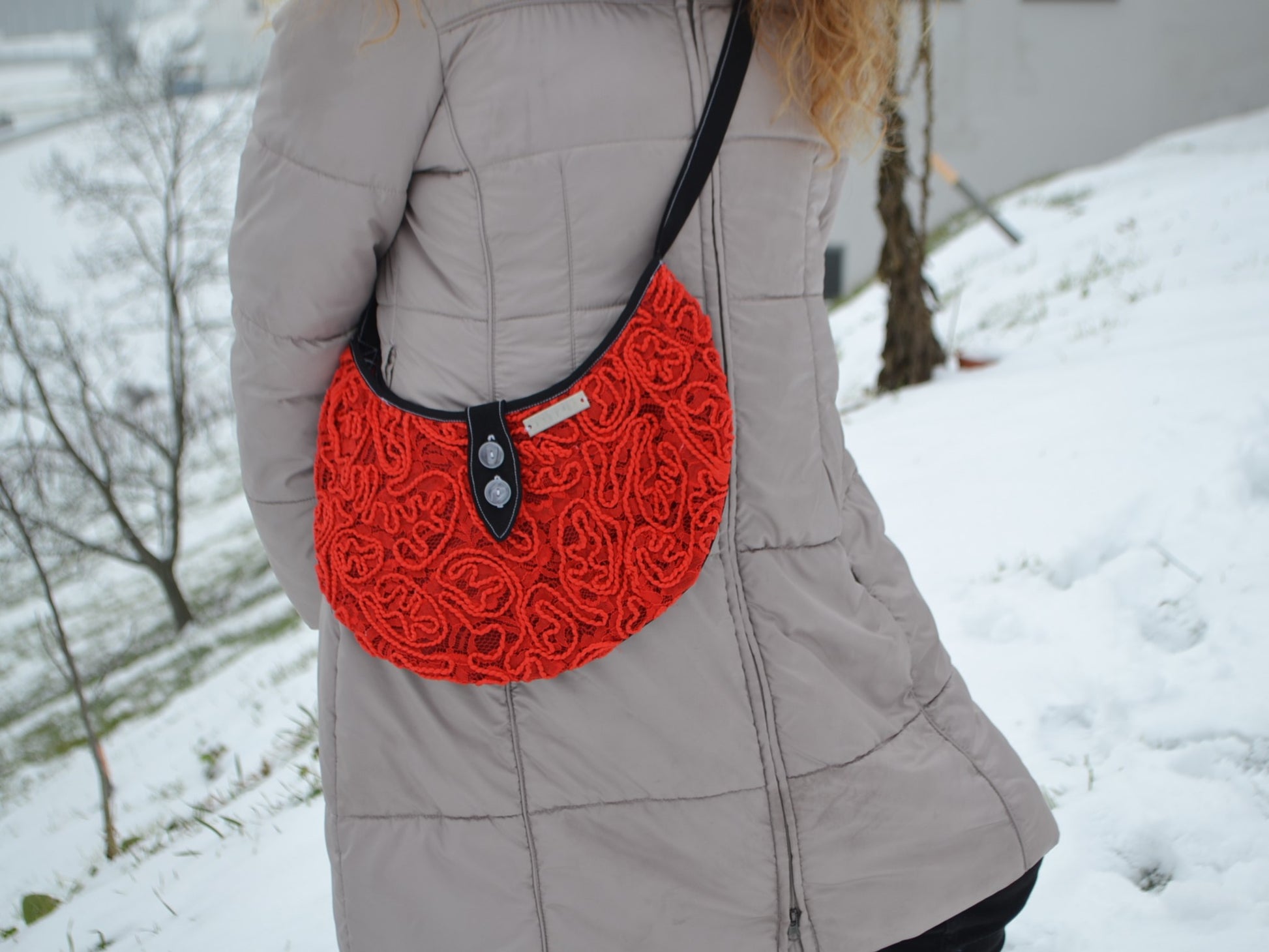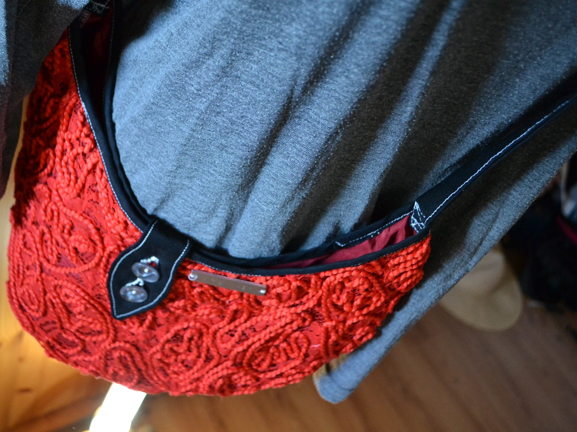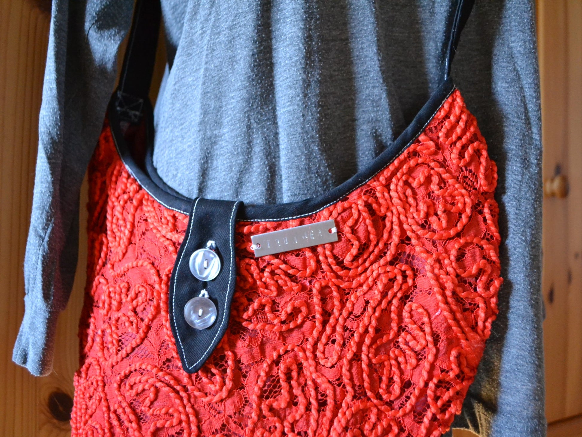 Die Handtasche "new moon red lace" wurde in Österreich handgefertigt und überzeugt durch ihre gute Verarbeitung. Der innen verarbeitete dunkelrote Futterstoff gibt der Tasche einen schönen abgerundeten Look.