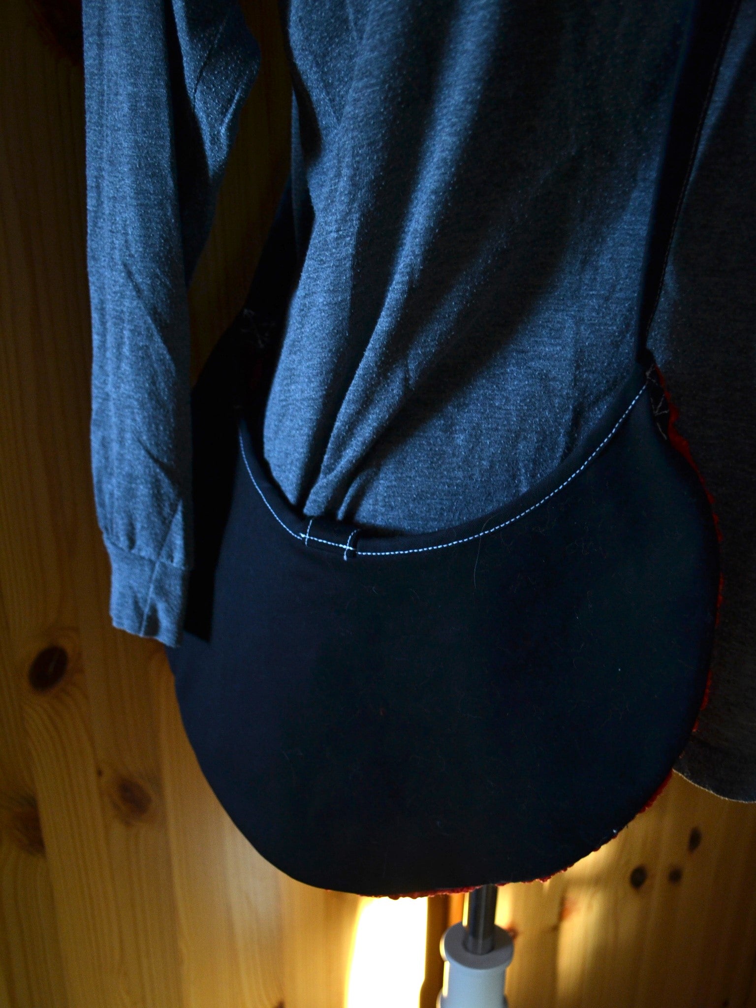 Für diese Tasche wurde ein Oberteil, Stoffreste und dunkelroter Futterstoff verwendet.