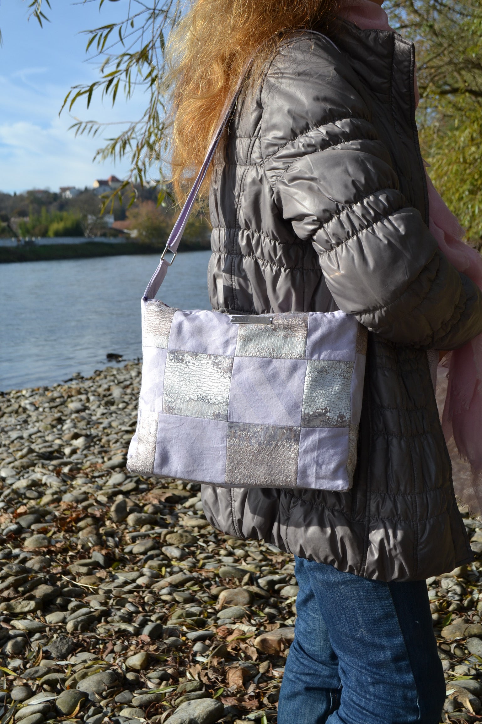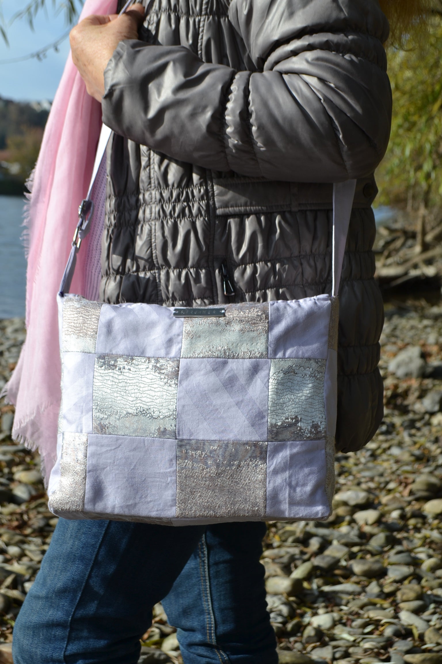 Diese Tasche wurde aus kleineren Stoffteilen und secondhand Futterstoff gefertigt.