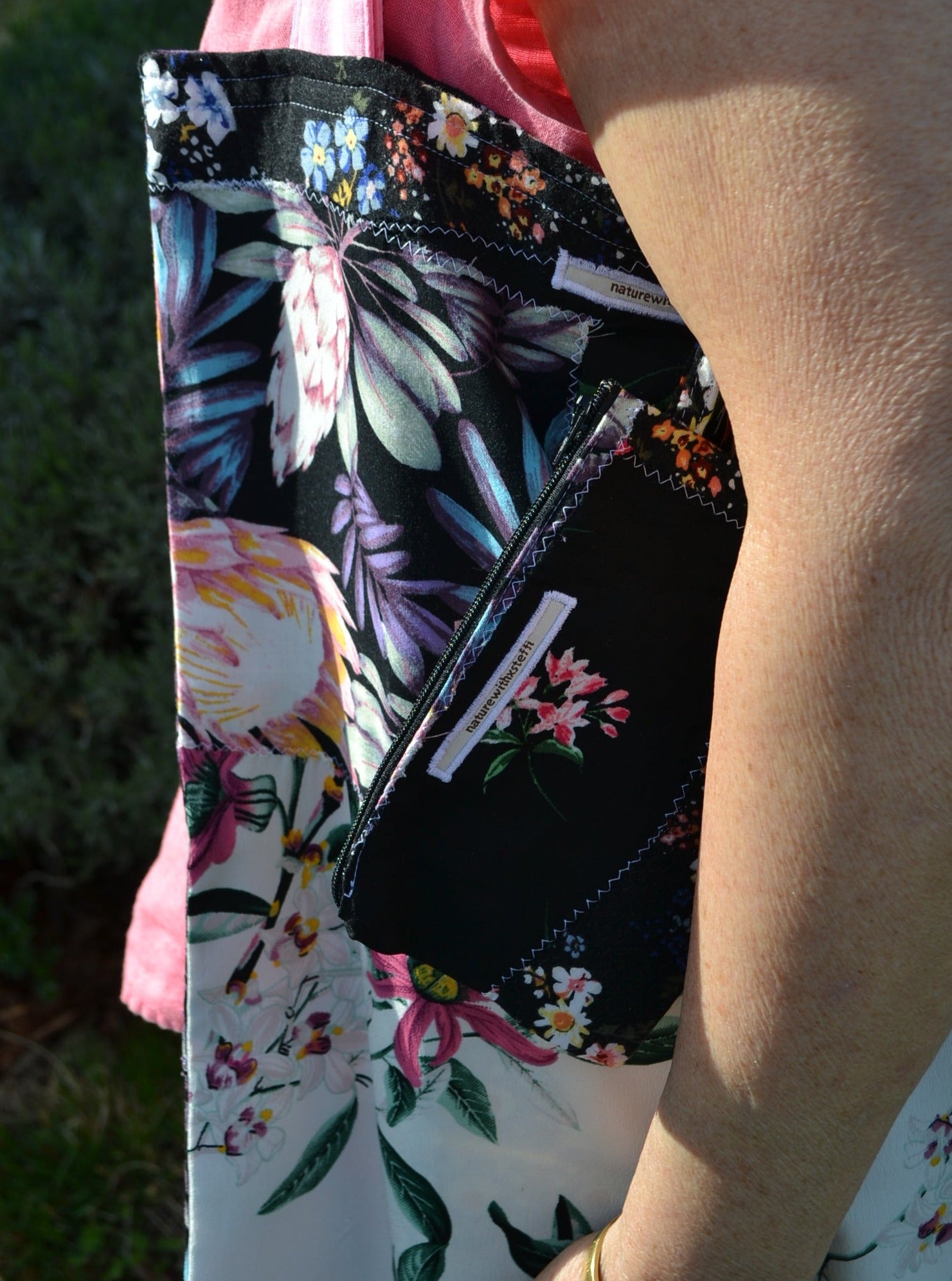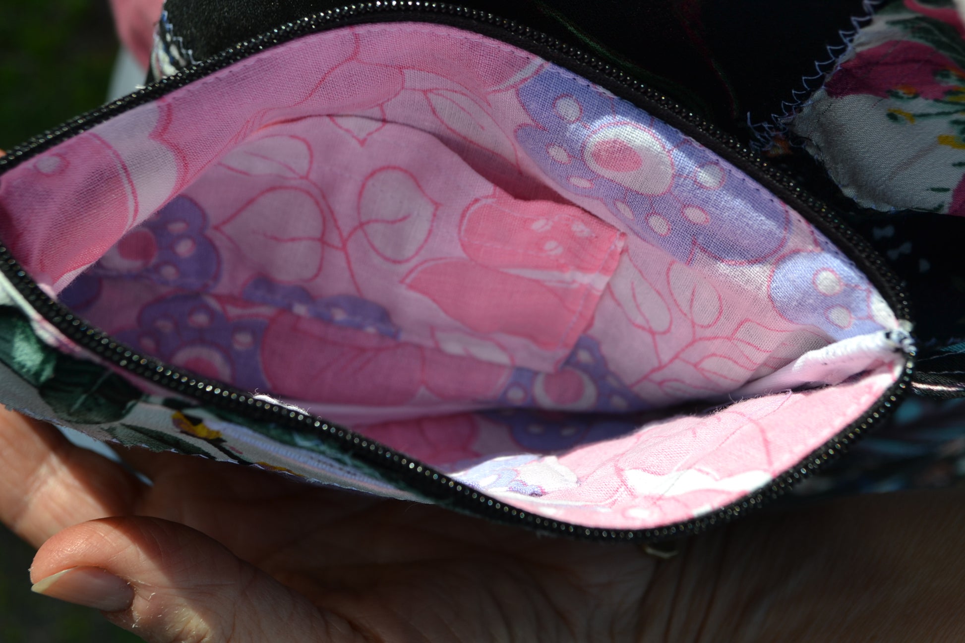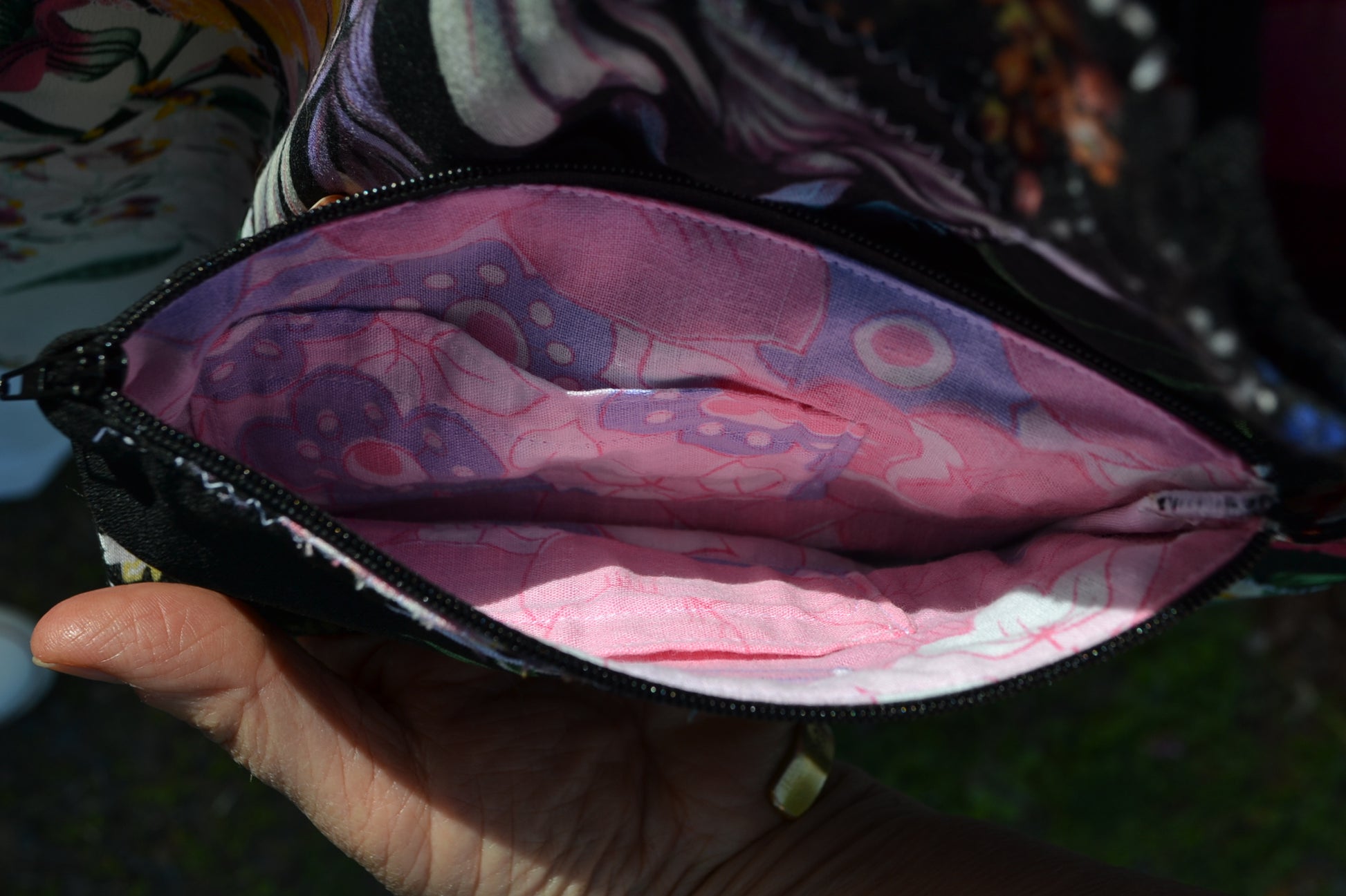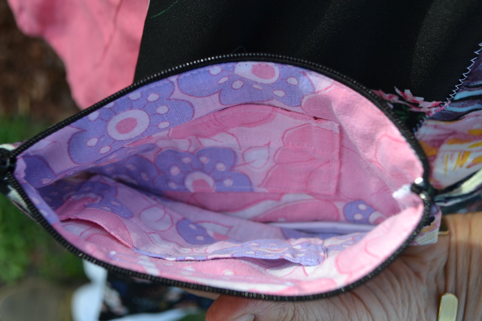 Für diese Tasche&Geldbörse wurden Stoff eines Oberteiles, Jumpsuits und einer Hose verwendet.