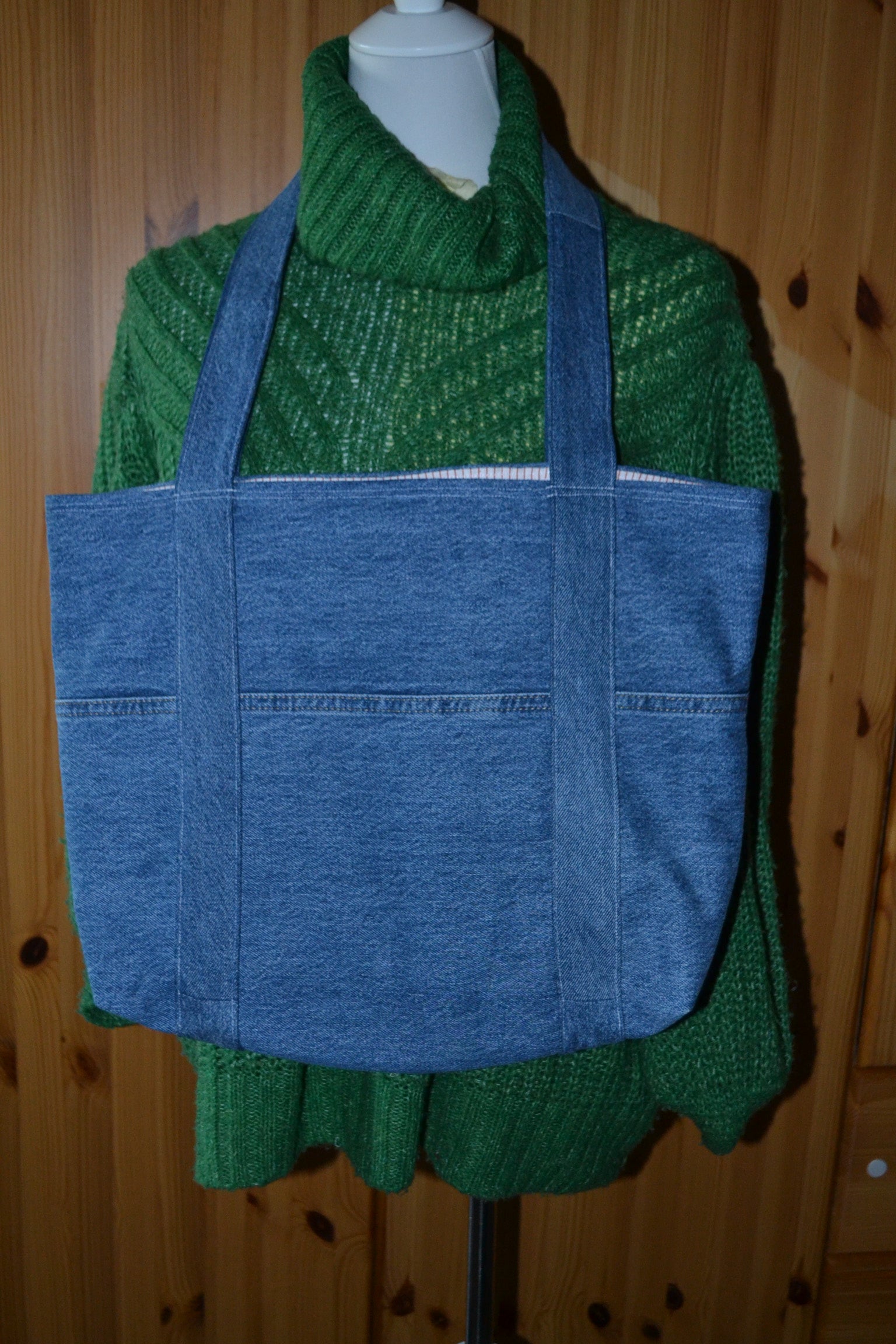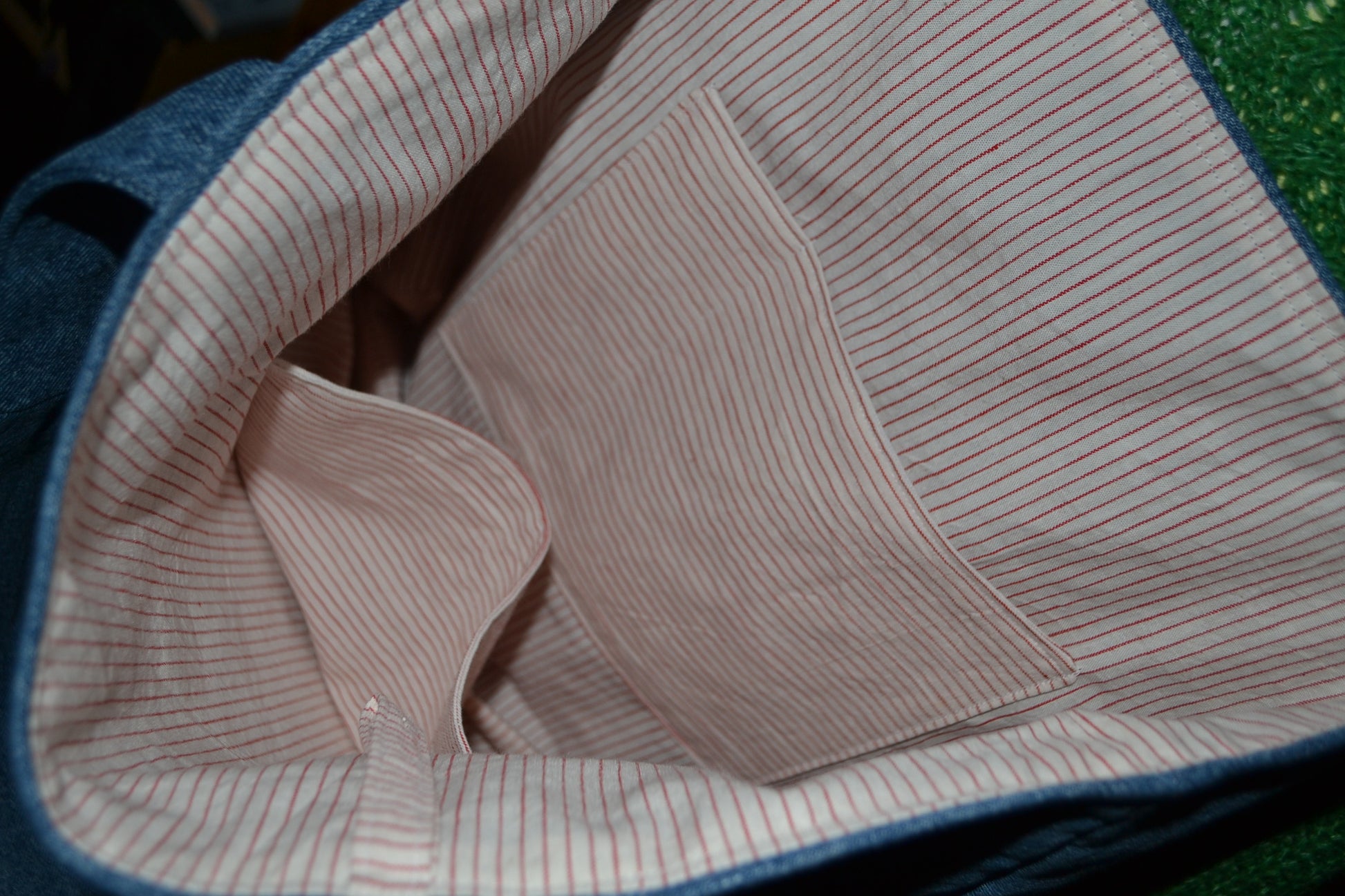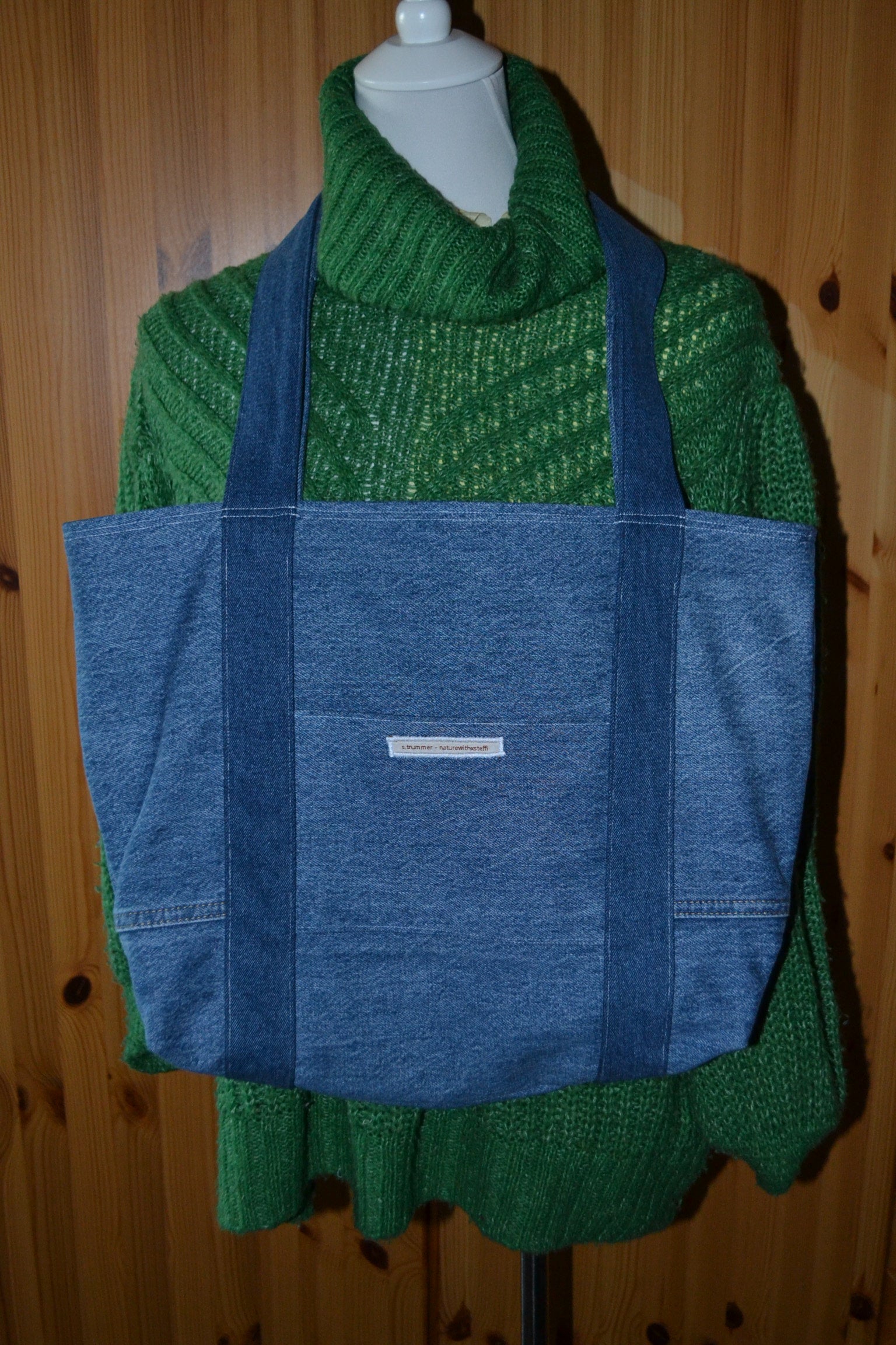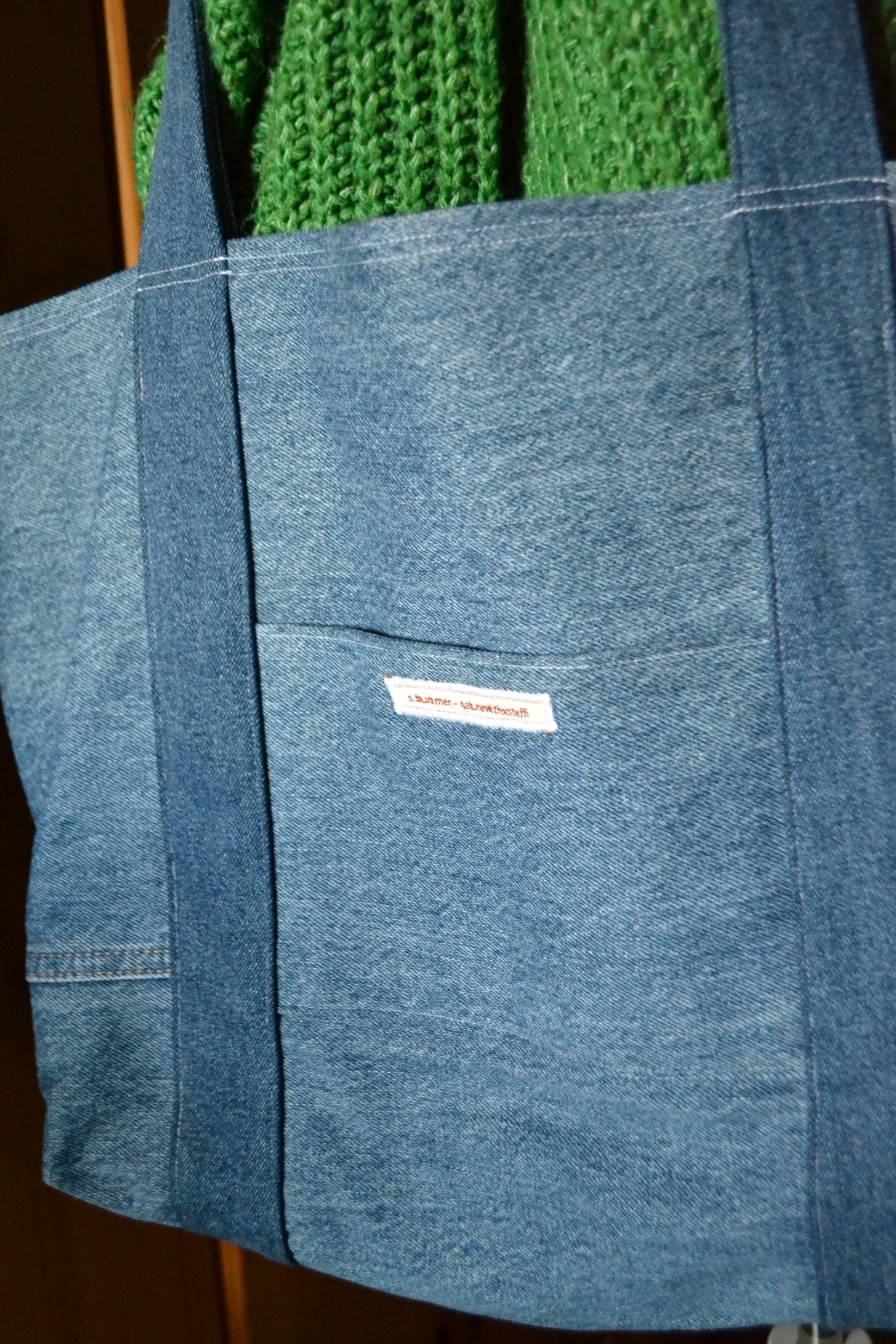 Für diese Tasche wurden aus zweiter Hand Stoffe genommen und secondhand Jeans wiederbelebt!