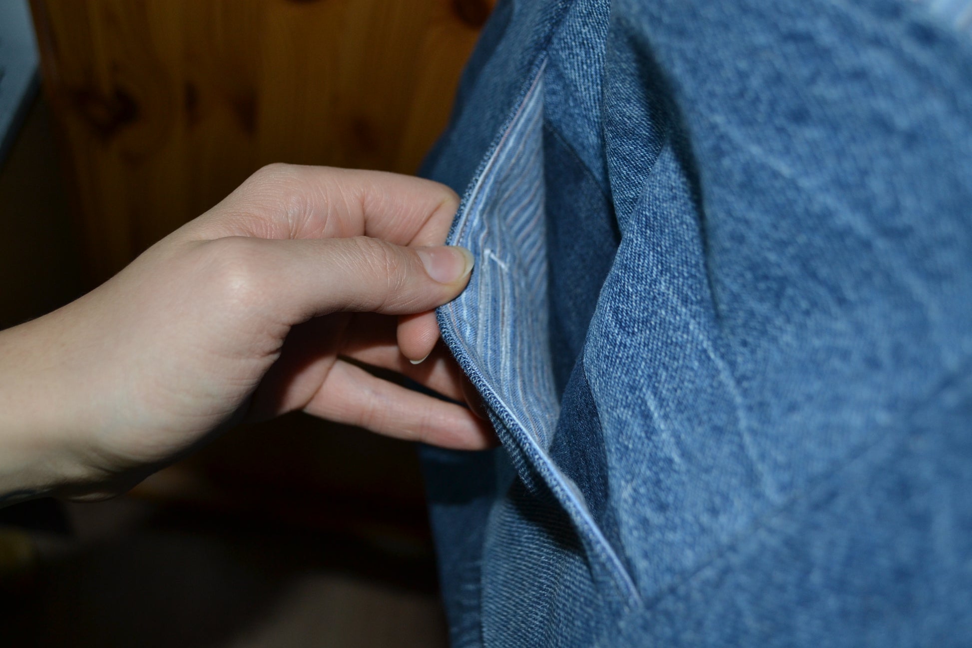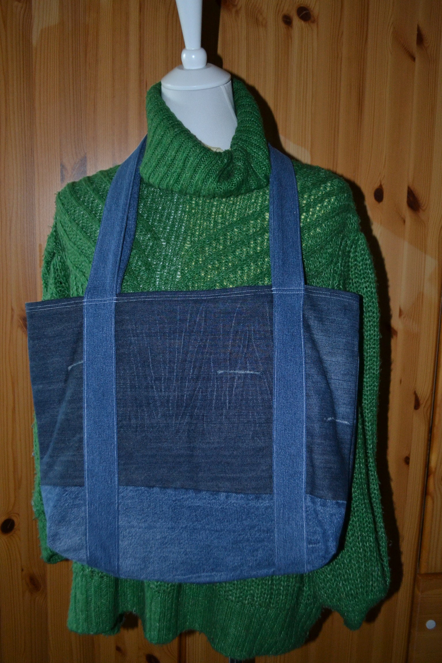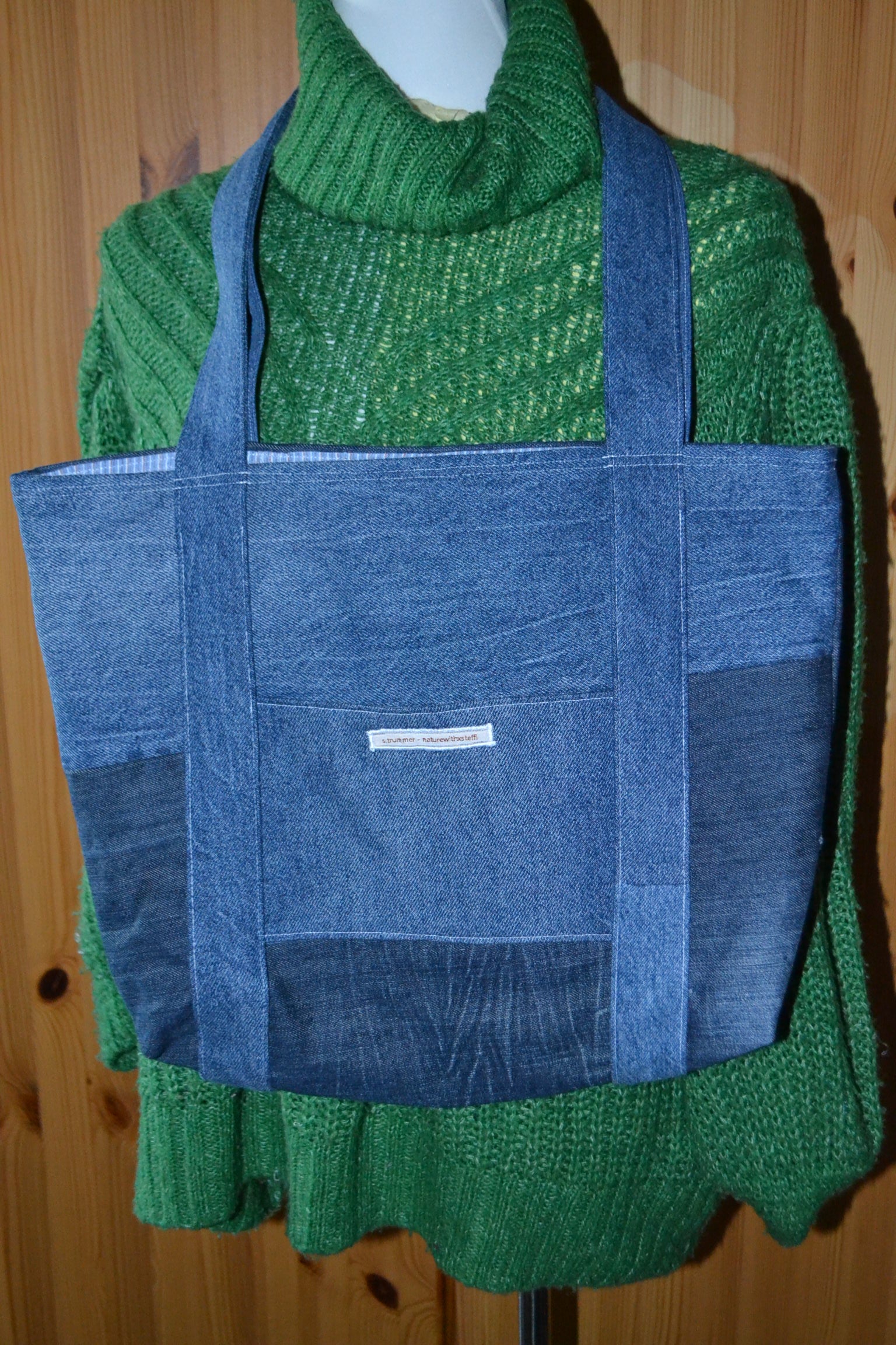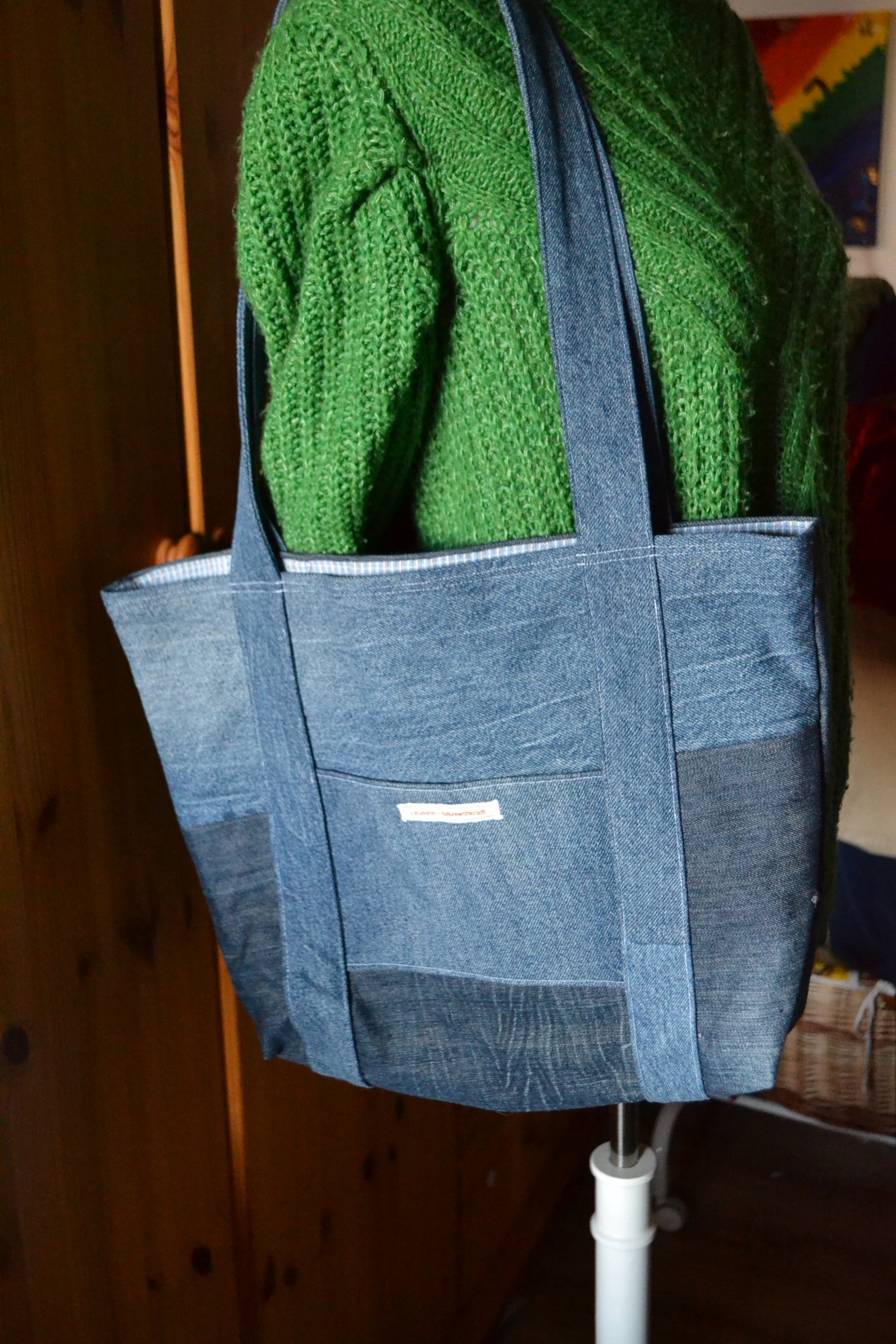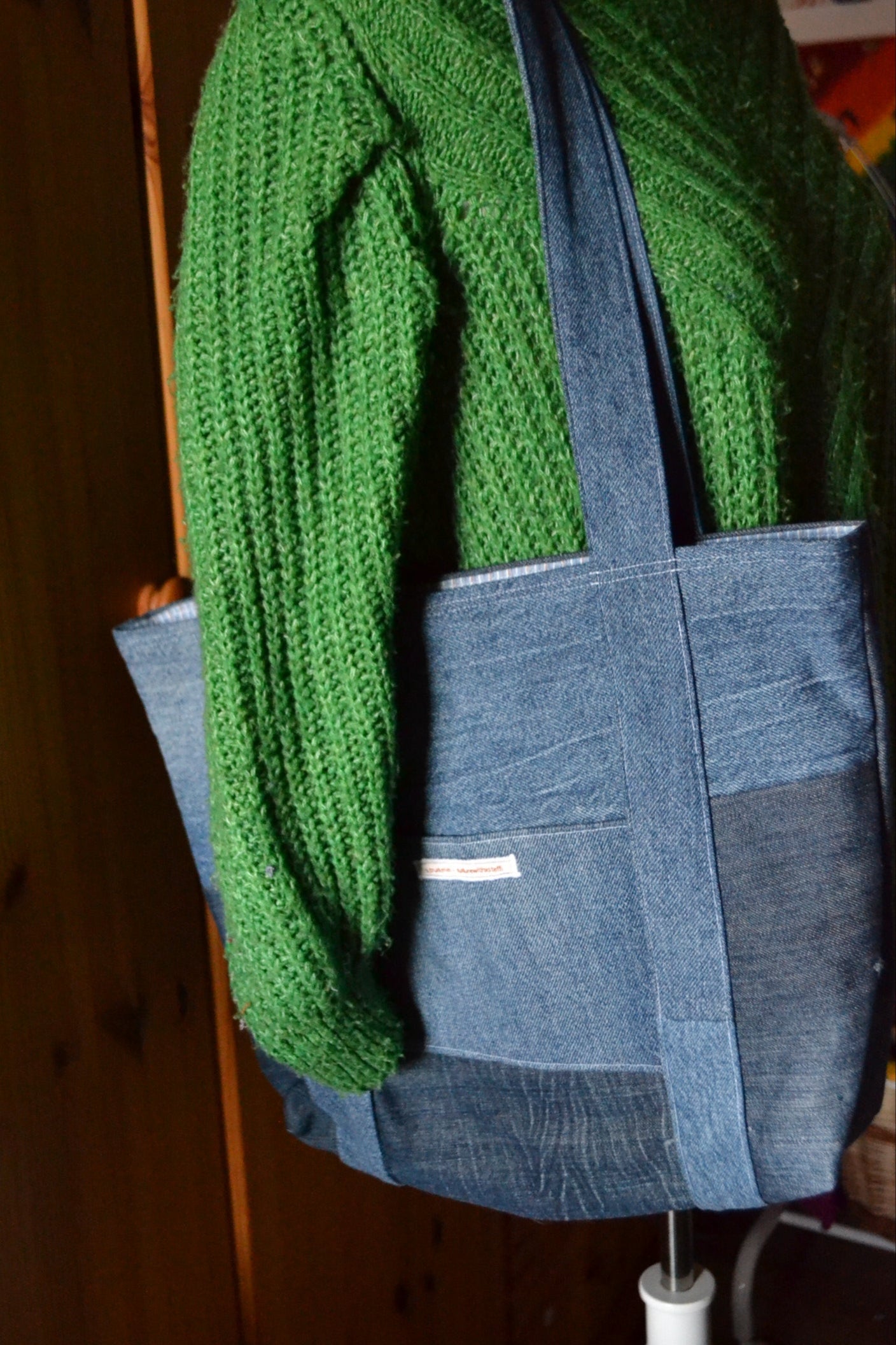 Für diese Tasche wurden aus zweiter Hand Stoffe genommen und secondhand Jeans wiederbelebt!