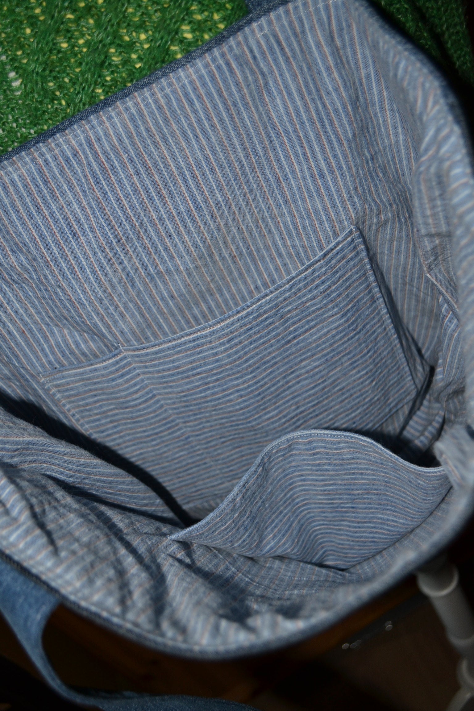 Die luxuriöse große Tragetasche aus secondhand Jeans mit blau gestreiften Innenstoff wurde aus 1,5 bis 2 gebrauchten Jeans gefertigt, dadurch bekommen alte, getragene Jeanshosen einen neuen Zweck und schauen dabei noch super cool aus! Durch den Außen Jeansstoff und den zusätzlichen Innenstoff, bietet sie extreme Stabilität, um sie durch jede Alltagssituation zu begleiten!