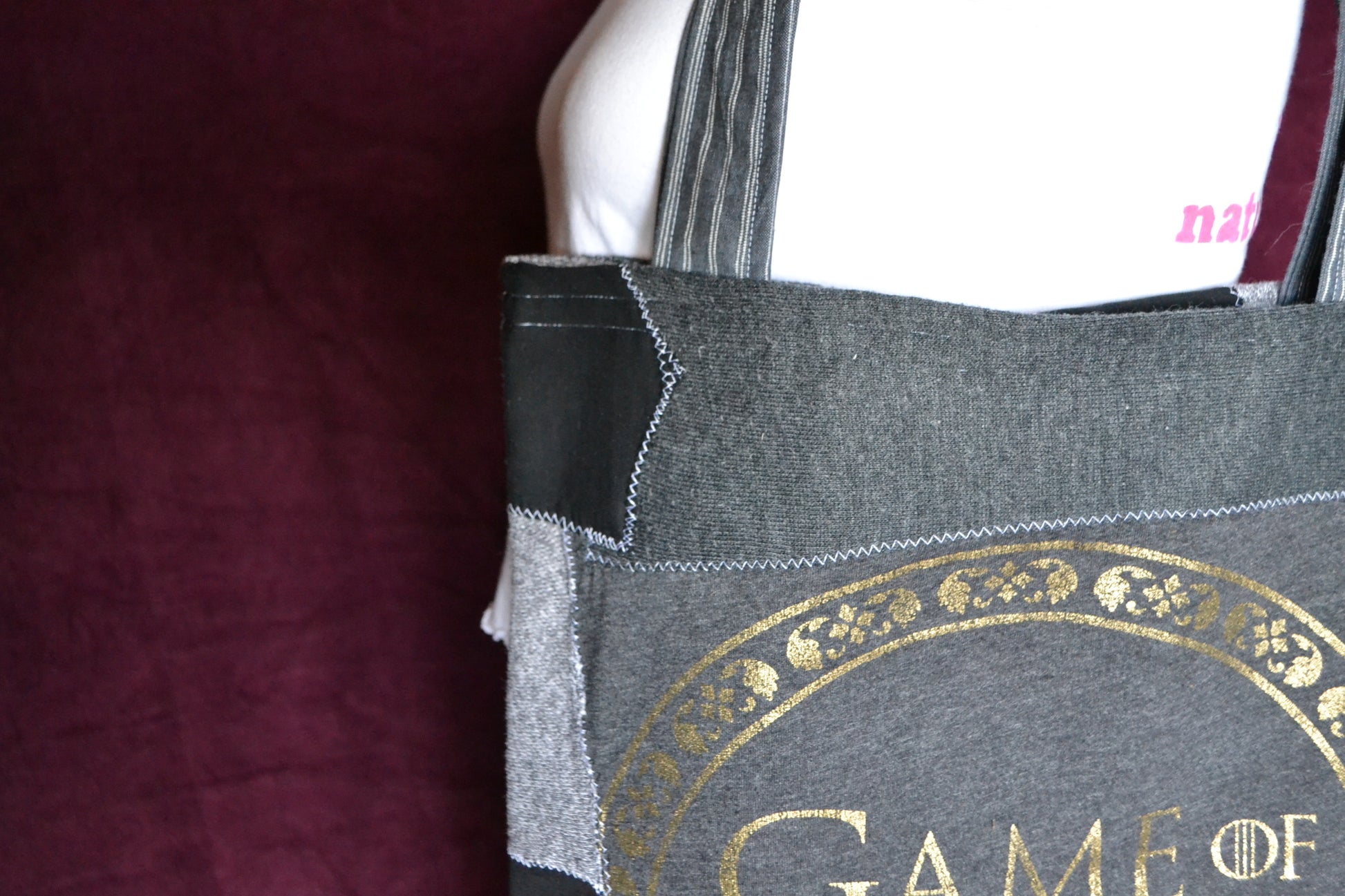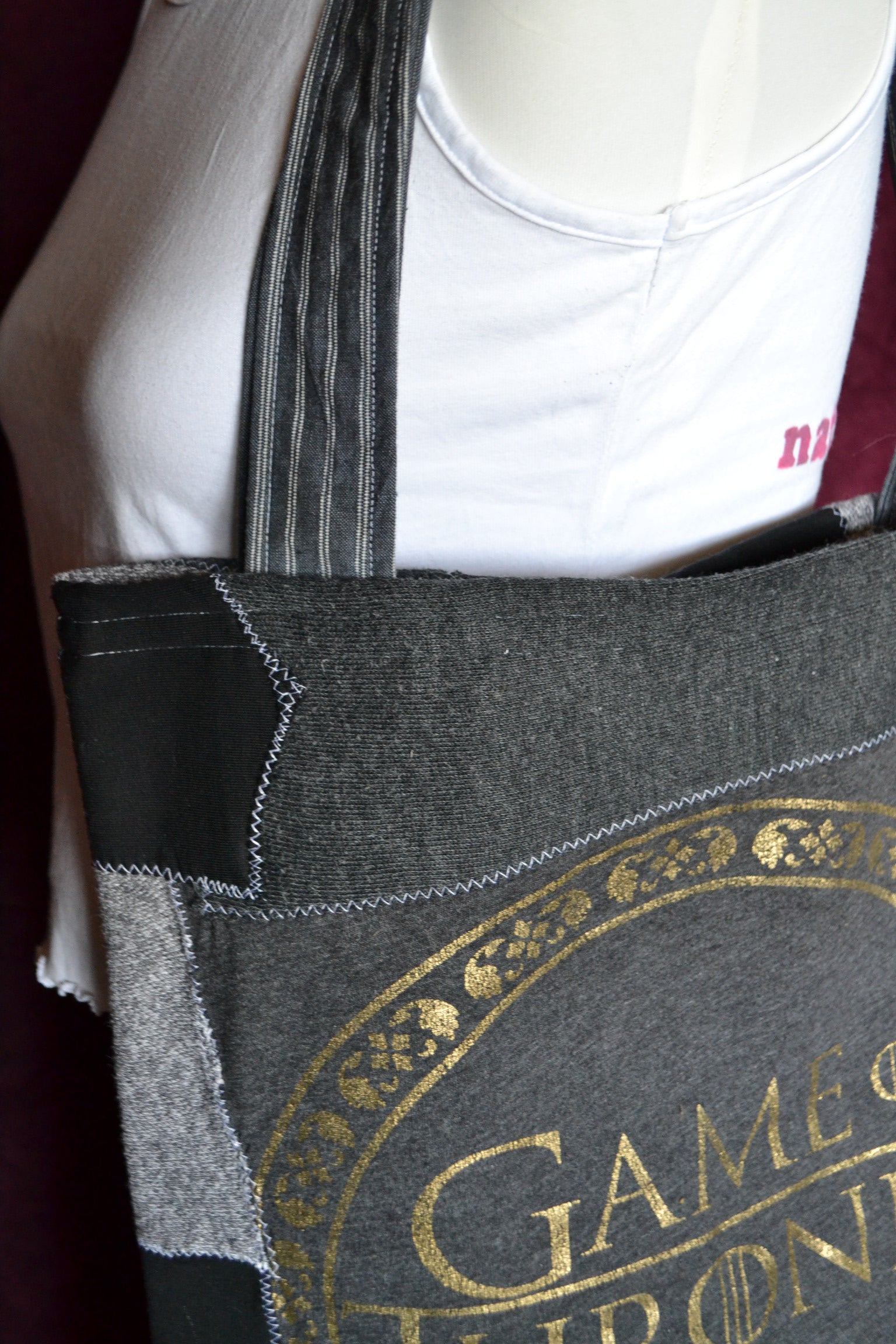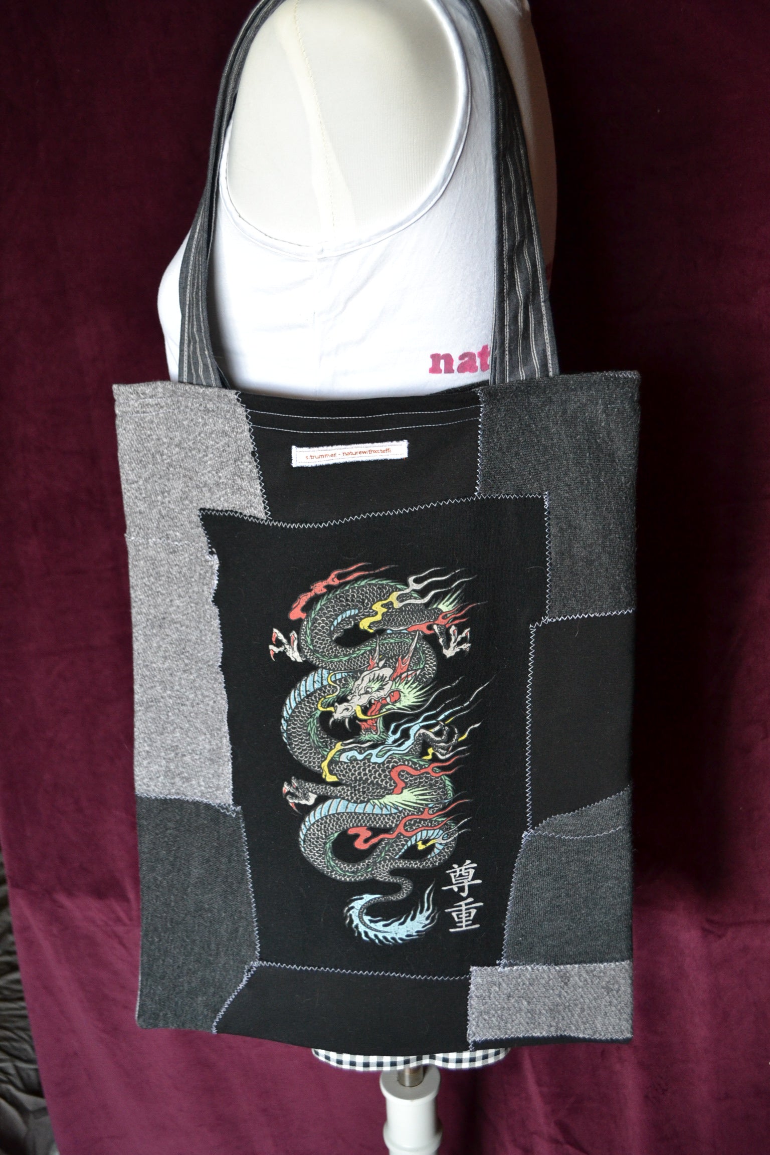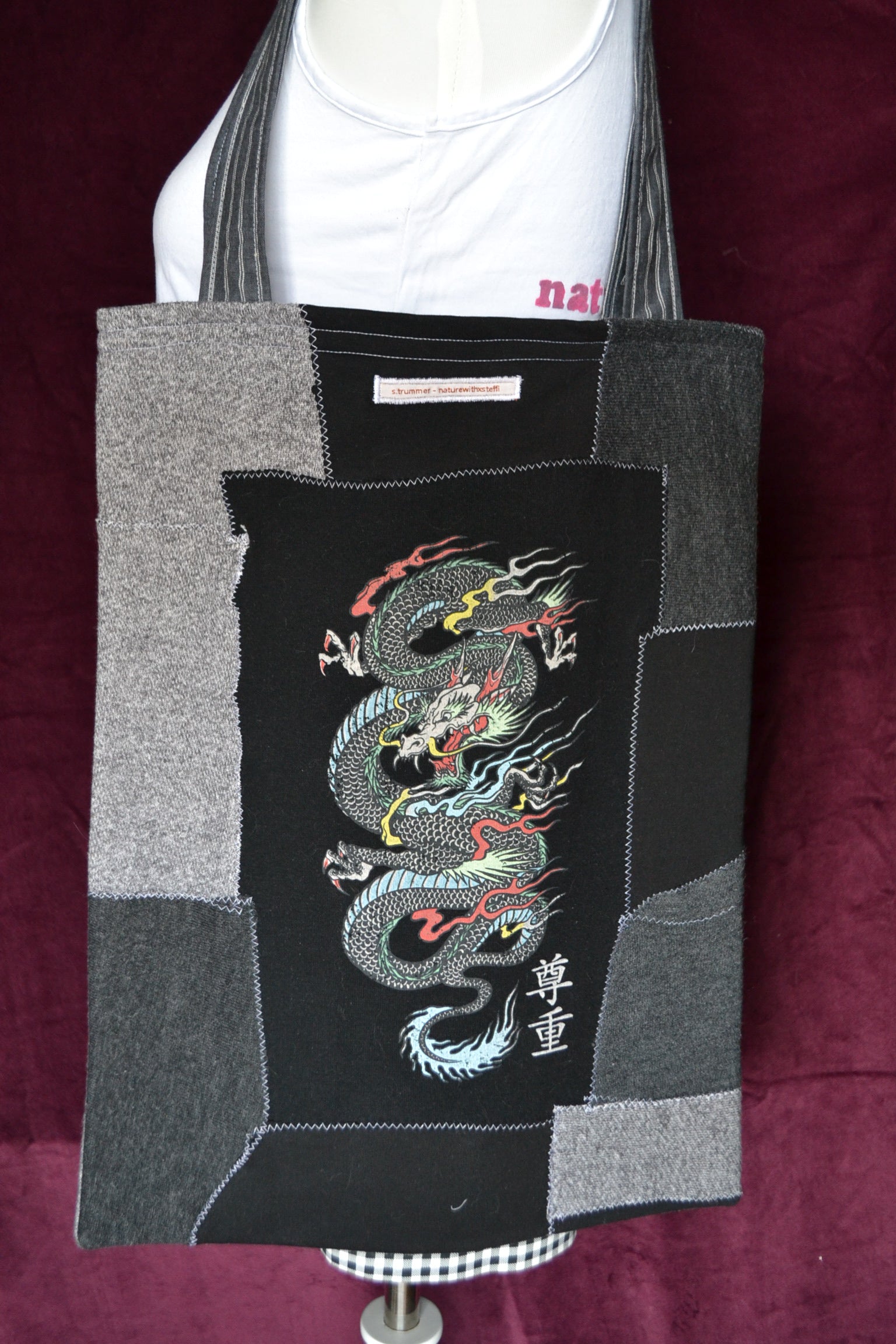 Für diese Tasche wurden der Stoff von Pullover, Shirts und secondhand Stoff verwendet.