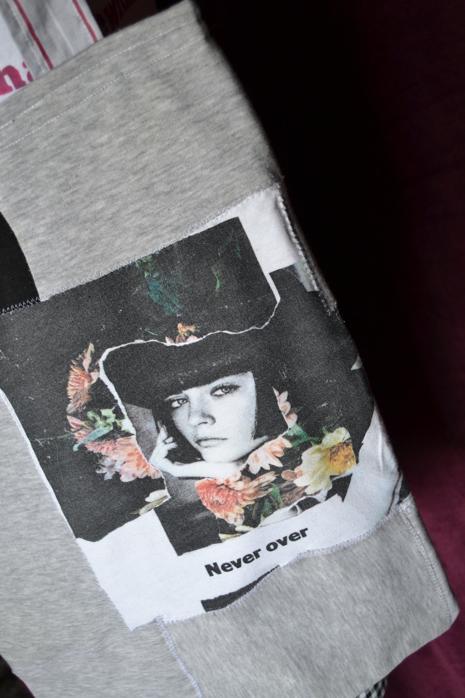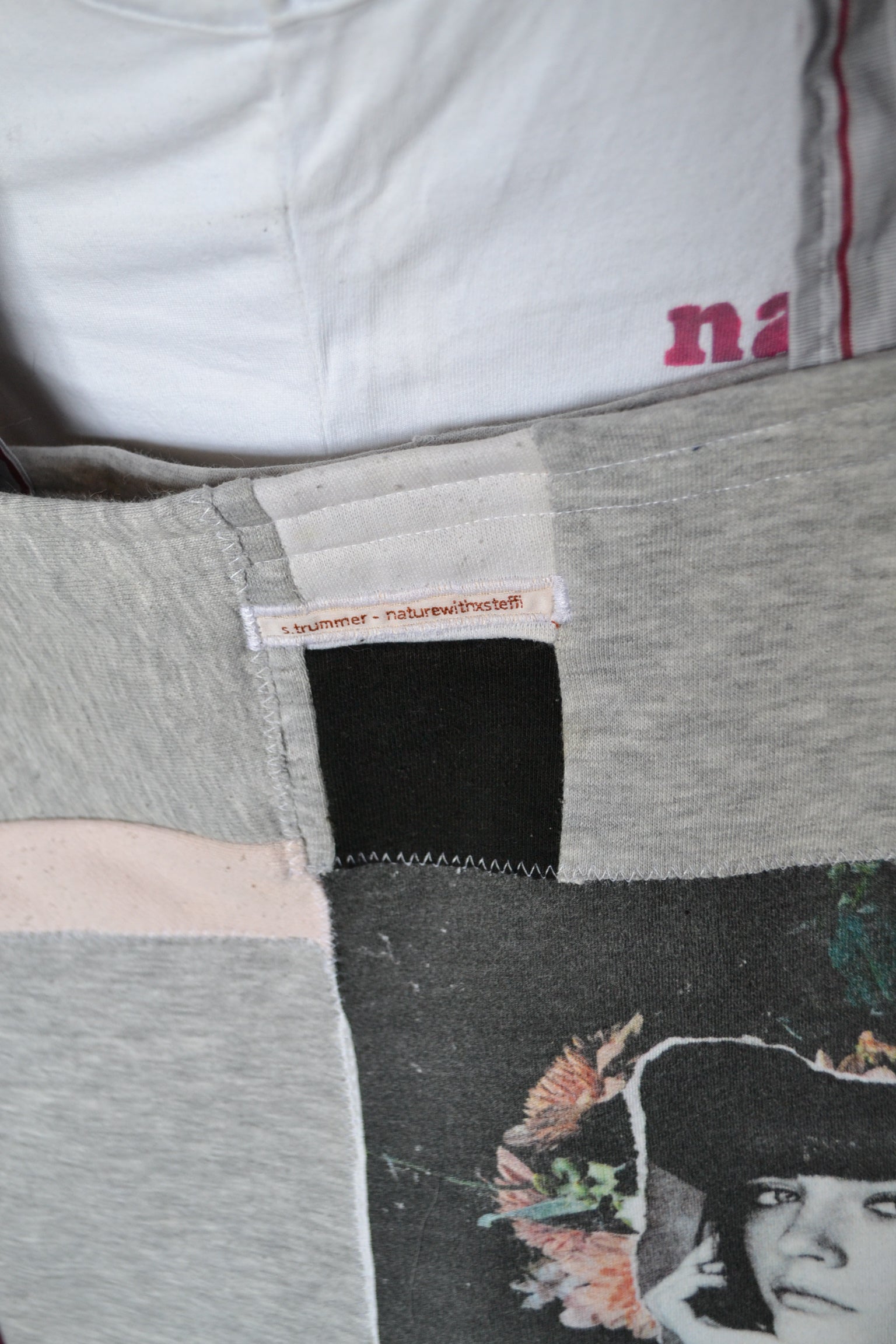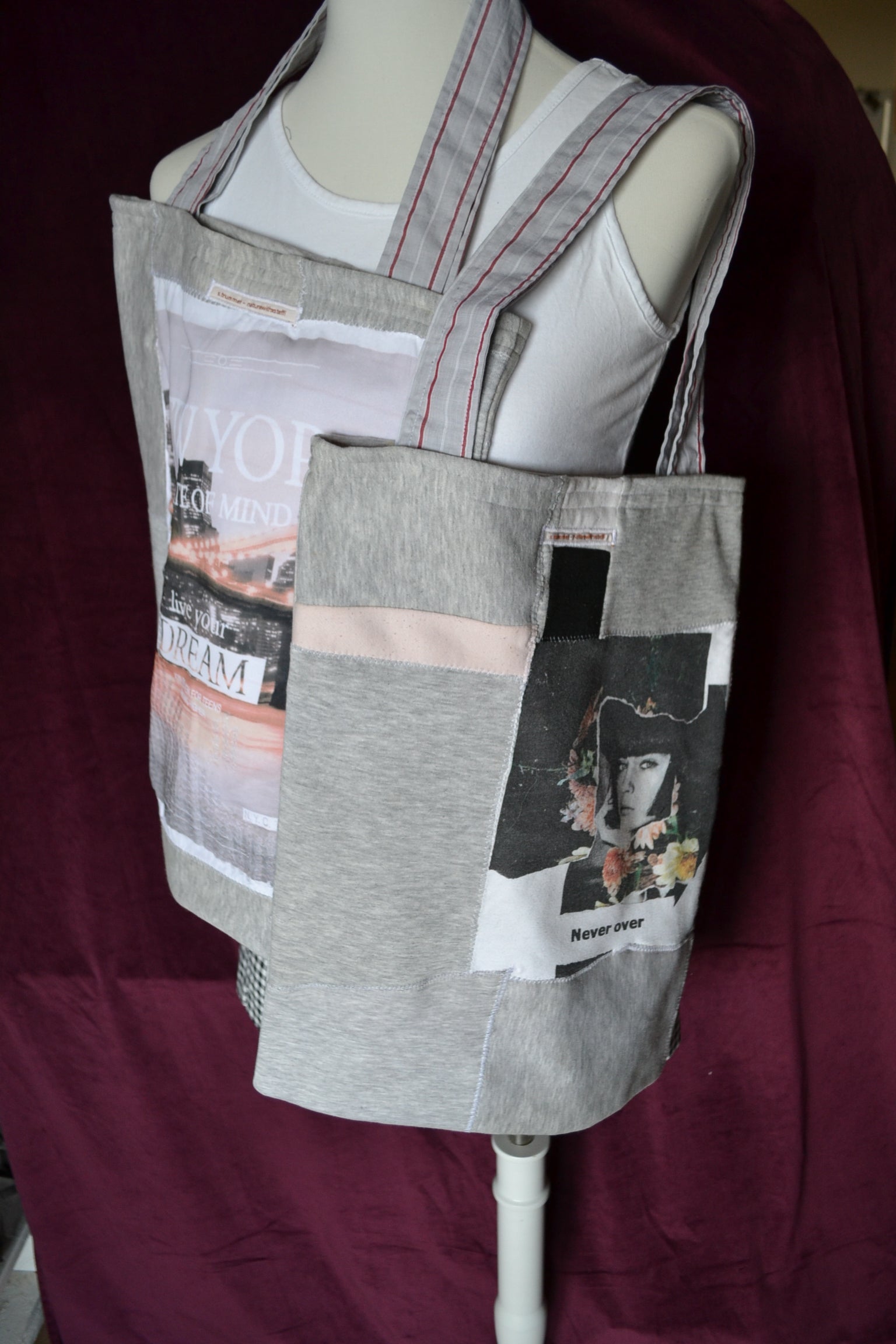 Für diese Tasche wurden der Stoff von Jogginghosen, Shirts und secondhand Stoff verwendet.