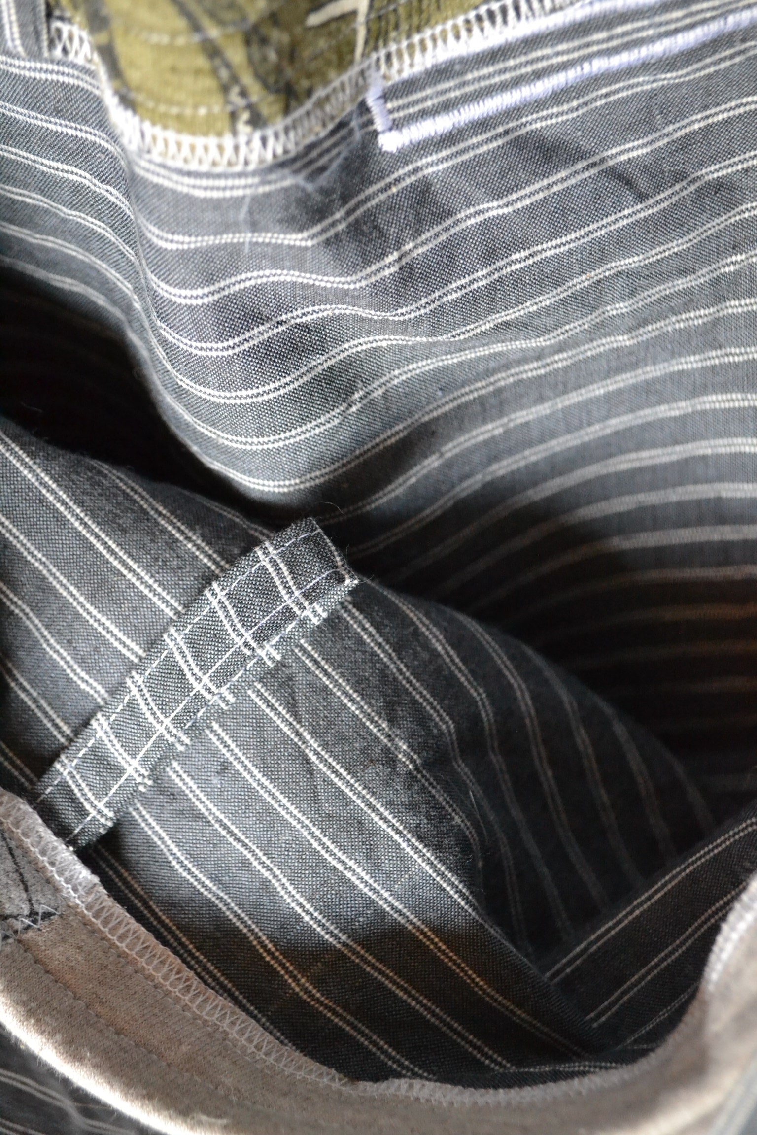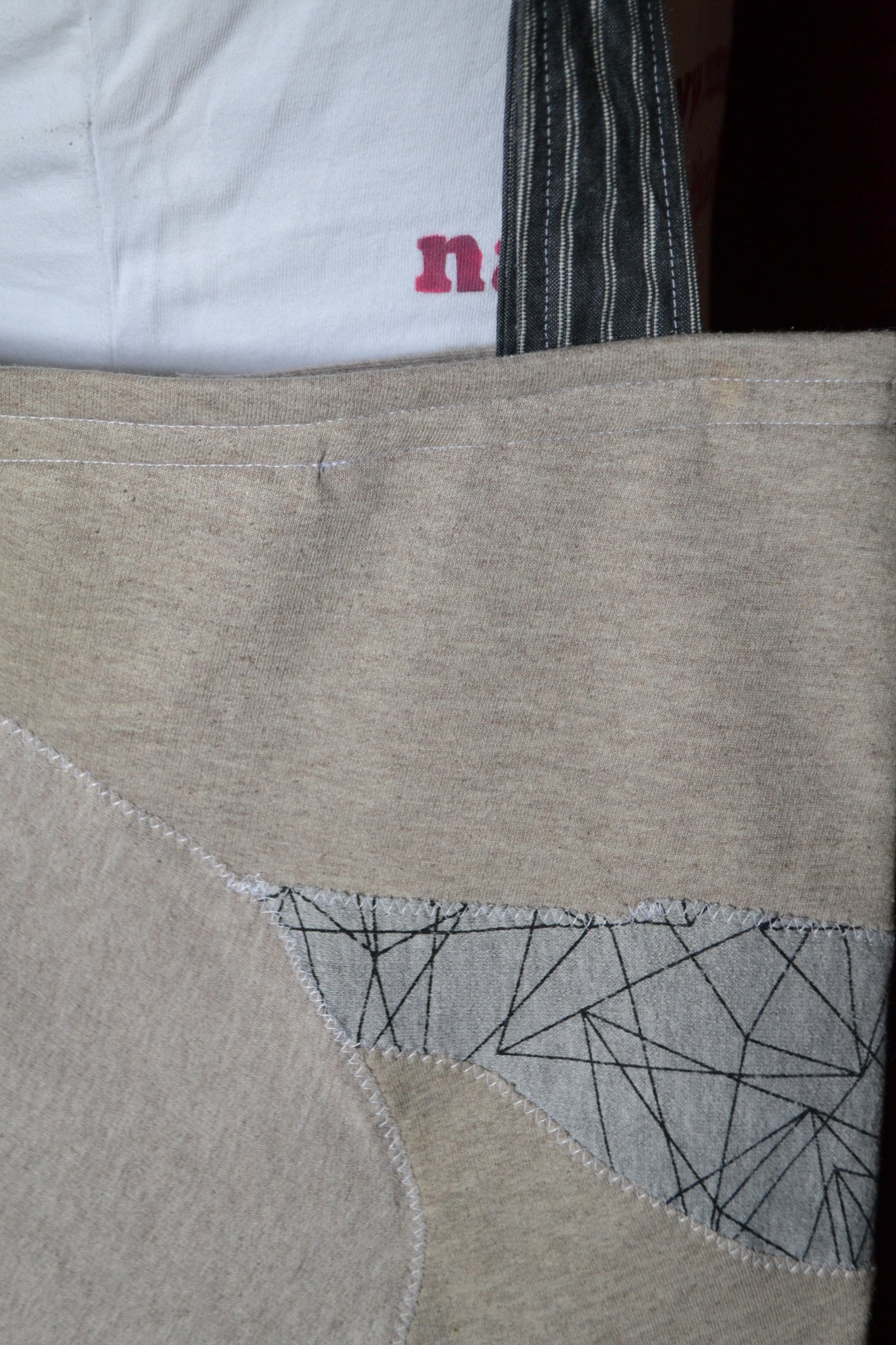 Für diese Tasche wurden der Stoff von Pullover, Hosen, Shirts und secondhand Stoff verwendet.