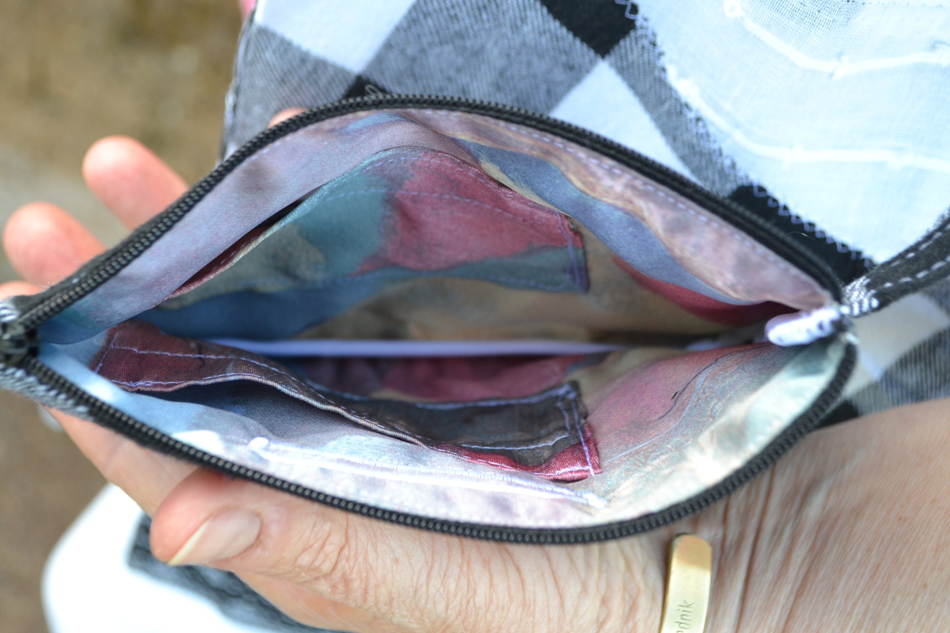 Für diese Tasche&Geldbörse wurden Stoff eines Hemdes und einer Hose verwendet.